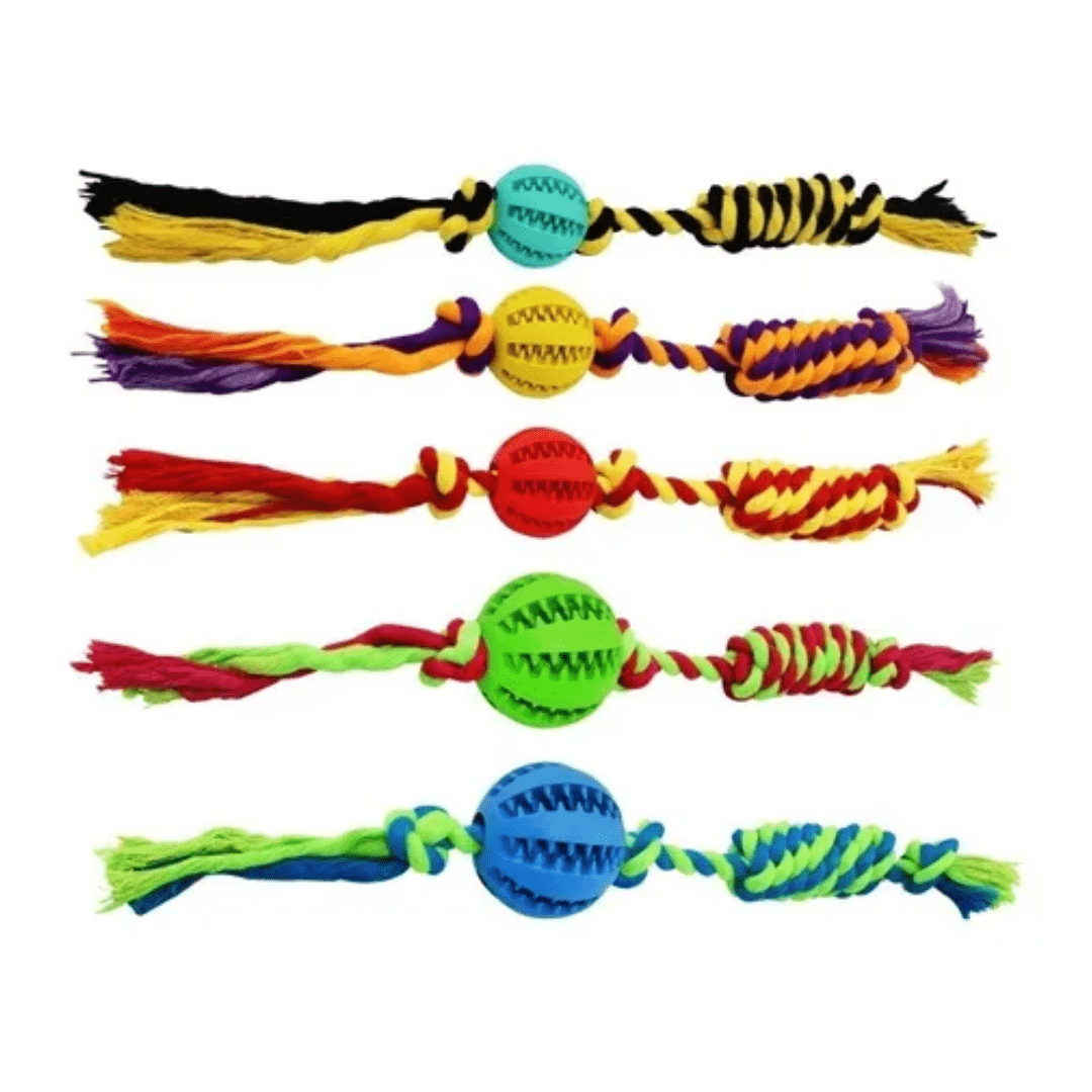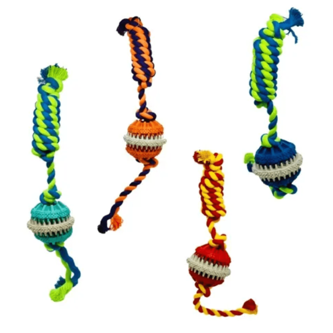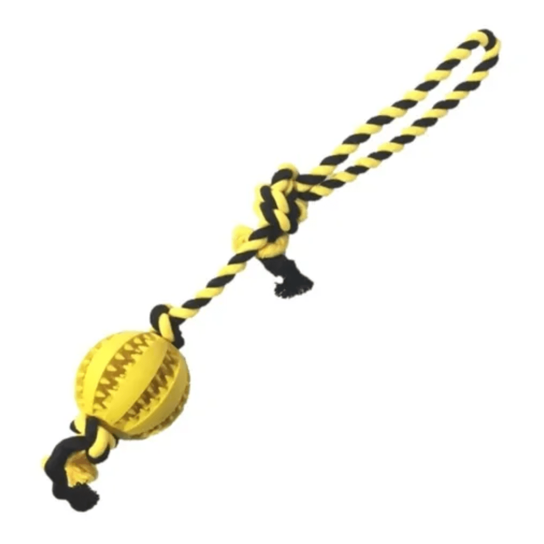 Pelota de goma con cuerda diseñada para que tu mascota libere stress, especialmente con dientitos de goma que le brindan un suave masaje a sus encías y ayuda a eliminar restos de comida y sarro de sus dientes mientras juega.
